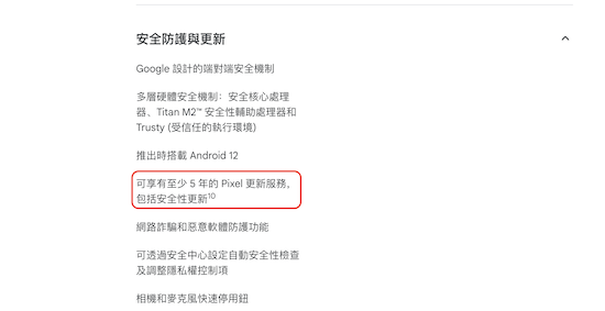 在Google官網(wǎng)給出的Pixel 6與Pixel 6 Pro技術(shù)規(guī)格頁(yè)面中的“安全防護(hù)與更新”中顯示,這兩款機(jī)型可享有至少5年的Pixel更新服務(wù),包括安全性更新。此前Pixel系列手機(jī),Google官方在此項(xiàng)給出的時(shí)效為3年。眾所周知,即時(shí)系統(tǒng)更新能力一直是Pixel手機(jī)重要賣點(diǎn)之一,該系列機(jī)型總能在第一時(shí)間升級(jí)至最新版本的Android系統(tǒng),甚至能夠無(wú)視硬件上的短板,例如Google官方給出的Android 12建議RAM為至少6GB,但RAM僅為4GB的Pixel 3系列,同樣隨著Pixel 6系列的發(fā)布,第一時(shí)間獲得了Android 12的大版本更新。