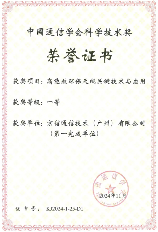 2024年11月29日到12月1日,2024中國信息通信大會(huì)暨中國通信學(xué)會(huì)學(xué)術(shù)年會(huì)在成都舉行,京信通信牽頭完成的《高能效環(huán)保天線關(guān)鍵技術(shù)與應(yīng)用》榮獲2024年中國通信學(xué)會(huì)科學(xué)技術(shù)獎(jiǎng)一等獎(jiǎng)。