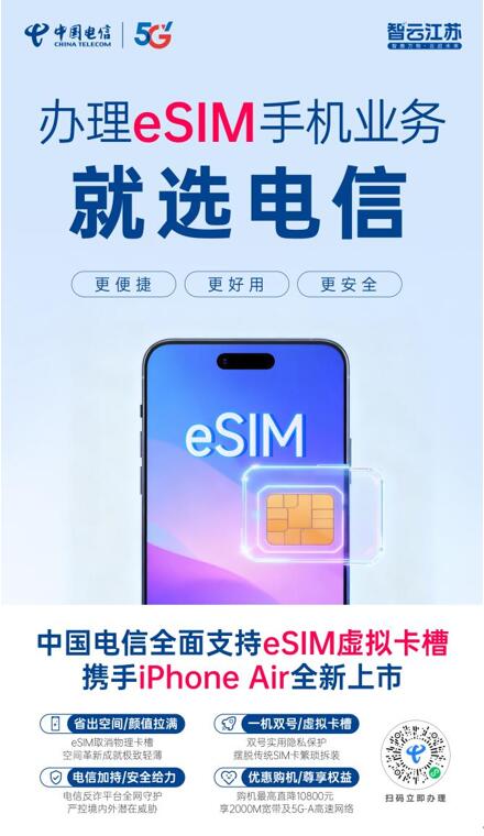 隨著工信部eSIM手機(jī)商用試驗(yàn)批復(fù)落地,中國(guó)電信在全國(guó)31個(gè)省區(qū)市同步啟動(dòng)eSIM手機(jī)業(yè)務(wù),江蘇電信用戶對(duì)“無(wú)卡通信”展現(xiàn)出高度期待。自10月22日iPhone Air手機(jī)上線以來(lái),這股通信技術(shù)革新的浪潮進(jìn)一步深度覆蓋江蘇大地,江蘇電信全面支持eSIM手機(jī)業(yè)務(wù),率先開(kāi)通預(yù)約通道,截至目前,預(yù)約量突破2萬(wàn)人次,業(yè)務(wù)辦理熱度居高不下。