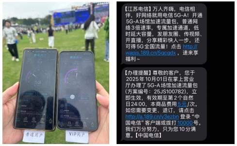 在數(shù)萬人密集的音樂節(jié)現(xiàn)場,率先加入體驗的南京樂迷小李用5G-A網(wǎng)絡(luò)開啟的高清直播全程無卡頓,“之前擔(dān)心人多網(wǎng)絡(luò)差,現(xiàn)在連4K畫質(zhì)都絲滑流暢。我剛拍下薛之謙的現(xiàn)場視頻,轉(zhuǎn)身就發(fā)了朋友圈,比身邊朋友快了足足半分鐘”。5G-A的飛速讓他成為朋友圈的“首評人”,此外,樂迷小李還有新發(fā)現(xiàn),他展示著手機(jī)上“電信場館VIP”的定制角標(biāo),這是辦理5G-A場館包后專屬的UE Logo標(biāo)識。 “真酷,太潮了!”
