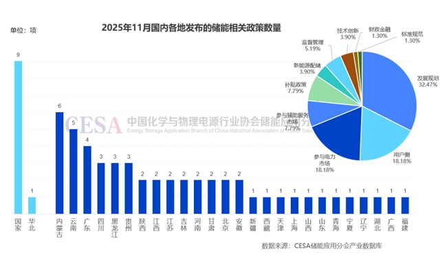 近期工業(yè)和信息化部組織召開的動(dòng)力和儲(chǔ)能電池行業(yè)座談會(huì),釋放出“有序出海”“反內(nèi)卷”“強(qiáng)質(zhì)量”的清晰信號(hào),標(biāo)志著行業(yè)進(jìn)入規(guī)范發(fā)展、提質(zhì)增效的新周期。臨近年末,政策發(fā)布更加密集,據(jù)CESA儲(chǔ)能應(yīng)用分會(huì)產(chǎn)業(yè)數(shù)據(jù)庫不完全統(tǒng)計(jì),2025年11月份共發(fā)布儲(chǔ)能相關(guān)政策77項(xiàng),國(guó)家層面發(fā)布9項(xiàng),涉及發(fā)展規(guī)劃、監(jiān)督管理、技術(shù)創(chuàng)新、標(biāo)準(zhǔn)規(guī)范等多個(gè)方面。