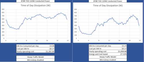 O-RU是接入網(wǎng)中功耗最高的組件。不過,可以通過多種手段實現(xiàn)節(jié)能,例如可變時鐘、動態(tài)功率放大器偏置、小區(qū)和載波關閉、射頻信道重新配置、睡眠模式、間斷收發(fā)等。隨著RAN的分解,需要明確各組件特性,以全面了解系統(tǒng)和網(wǎng)絡層面的權衡。圖5對比展示了啟用和未啟用微睡眠模式時,O-RU站點在24小時內(nèi)的功耗以及潛在的節(jié)能效果。