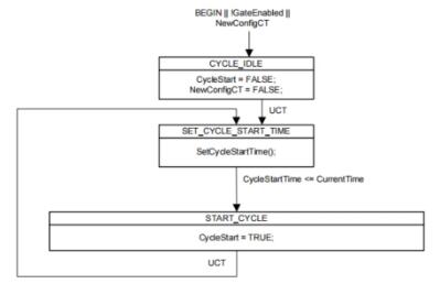 SetCycleStartTime()過程確定下一個GCL執(zhí)行周期開始的時間。該過程根據(jù)Current Time、Oper Base Time、Oper Cycle Time、Oper Cycle Time Extension、Config Change Time和Config Pending的值,將Cycle Start Time變量設(shè)置為起始時間,具體規(guī)則如下: