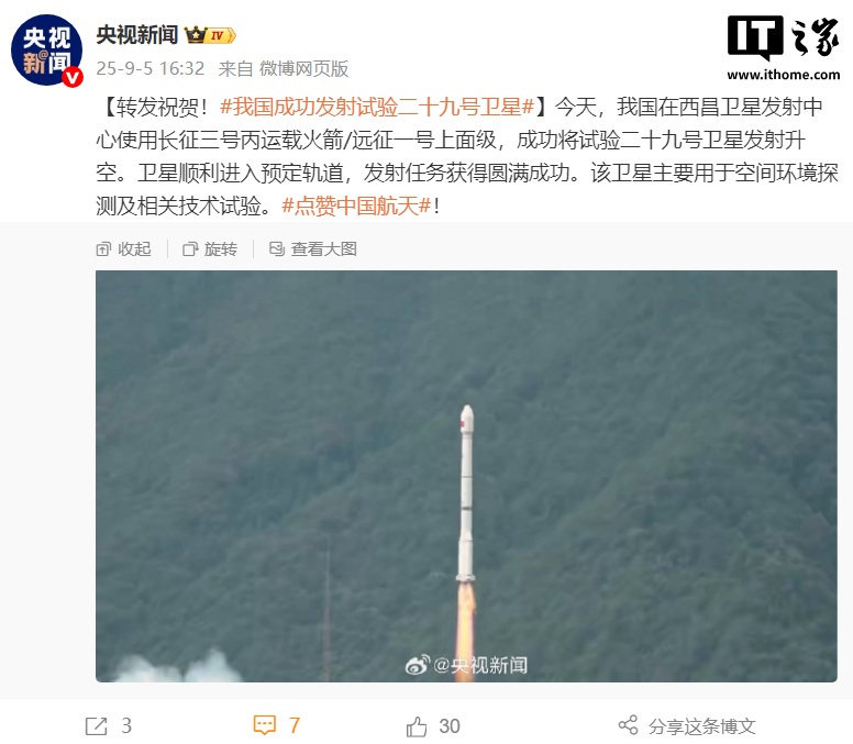 9 月 5 日消息,據(jù)央視新聞報道,北京時間 2025 年 9 月 5 日 10 時 34 分,我國在西昌衛(wèi)星發(fā)射中心使用長征三號丙運載火箭 / 遠征一號上面級,成功將試驗二十九號衛(wèi)星發(fā)射升空,衛(wèi)星順利進入預定軌道,發(fā)射任務獲得圓滿成功。