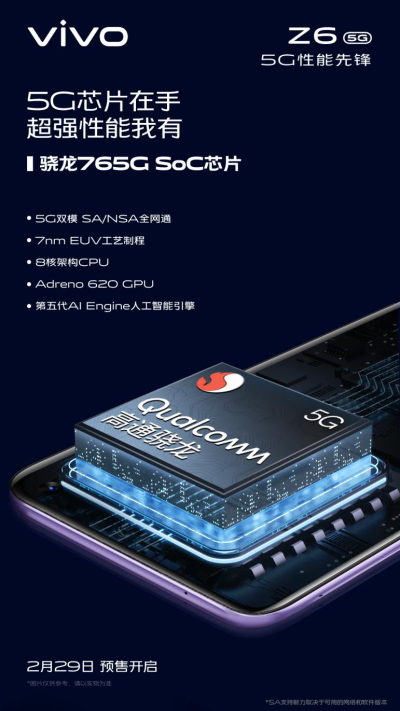 據(jù)了解,vivo Z6主打5G性能先鋒,搭載驍龍765G雙模5G處理器,支持雙模5G SA/NSA全網(wǎng)通,可5G和4G雙卡雙待,并通過智能切換5G/4G保證網(wǎng)絡(luò)時刻在線。