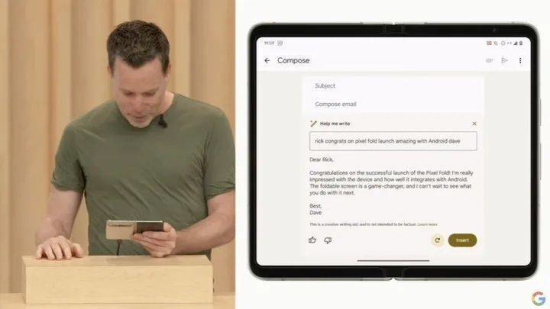 讓 AI 修整后,就變成了:親愛(ài)的 Rick,恭喜你能夠在這次的大會(huì)上,成功發(fā)布 Pixel Fold,它和 Android 的合作一定會(huì)改變整個(gè)市場(chǎng)和技術(shù)的發(fā)展動(dòng)態(tài)。