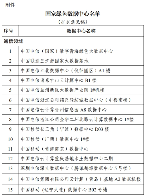 飛象網(wǎng)訊(致新/文)5月6日消息,工信部近日公示國家綠色數(shù)據(jù)中心名單。如有不同意見,可以于2024年5月10日前將書面意見反饋至工業(yè)和信息化部節(jié)能與綜合利用司。