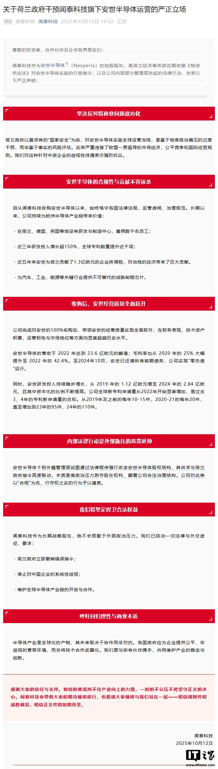 聞泰科技 10 月 12 日晚發(fā)表聲明,譴責荷蘭政府以“國家安全”為由凍結(jié)安世半導體全球運營,稱此舉違背市場經(jīng)濟原則。安世半導體個別外籍管理層試圖通過法律程序改變股權結(jié)構,聞泰科技認為這是借政治壓力剝奪股東權利。公司表示將捍衛(wèi)合法權益,呼吁回歸商業(yè)本質(zhì)。