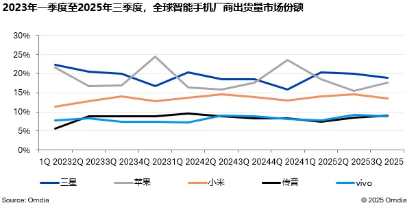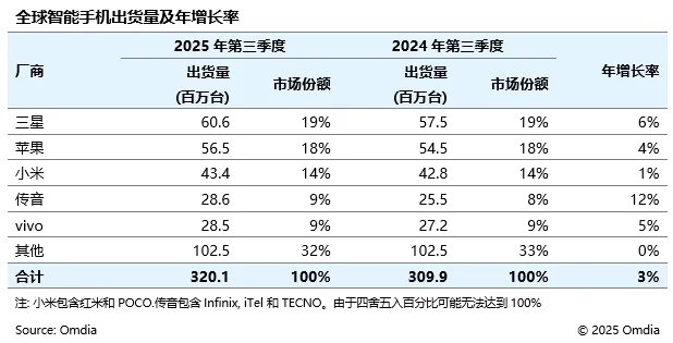 Omdia 報(bào)告 2025Q3 全球手機(jī)出貨量:三星同比增 6%、蘋果增 4%、小米增 1%、傳音增 12%、vivo 增 5%