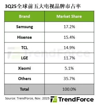 全球前五大電視品牌依序為 Samsung(三星)、Hisense(海信)、TCL、LGE 與 Xiaomi(小米),合計市占率達 64.3%。其中海信下半年起由守轉攻,內(nèi)外銷皆以低價搶市,成功推升第三季出貨量達 766 萬臺、環(huán)比增長 9.7%,重回全球第二,市占率也提升至 15.4%,創(chuàng)歷年同期新高。