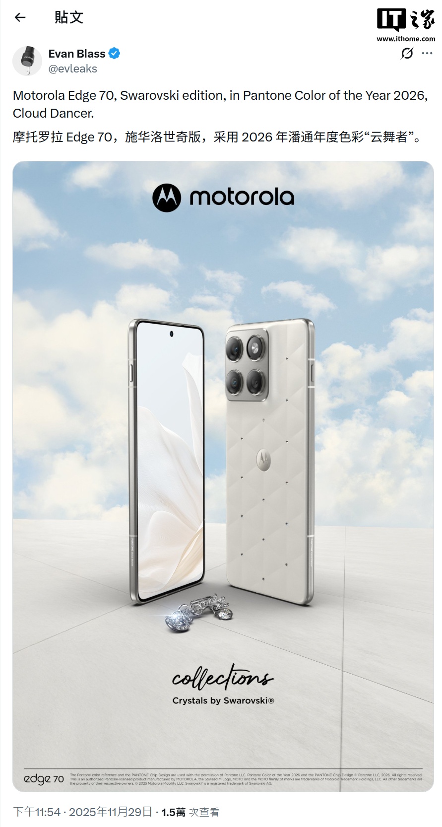 消息稱摩托羅拉即將推出施華洛世奇水晶版 Edge 70 手機(jī),采用 Pantone 2026 年度代表色