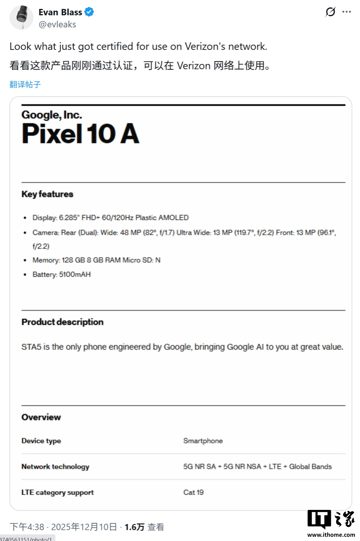 12 月 11 日消息,消息源 Evan Blass 昨日(12 月 10 日)在 X 平臺(tái)發(fā)布推文,分享了一份來自美國(guó)運(yùn)營(yíng)商 Verizon 的認(rèn)證文件,首次揭示了谷歌 Pixel 10a 手機(jī)的部分核心規(guī)格。