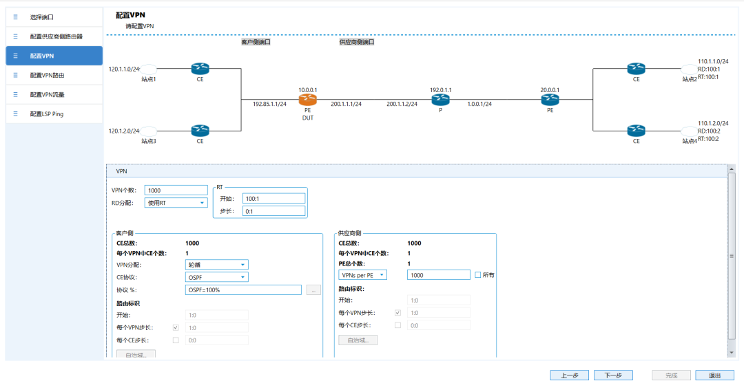 Step-4.配置1000個(gè)IP VPN,并設(shè)置RD、RT都從100:1開(kāi)始遞增;