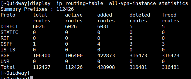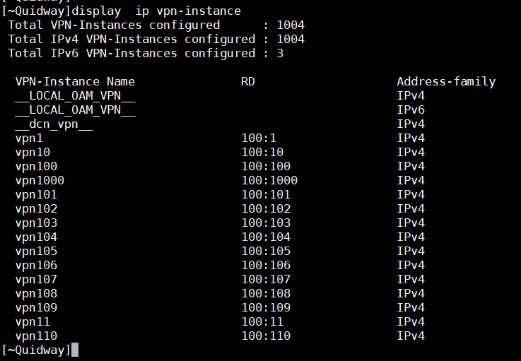 在DUT上檢查,共1000個(gè)VPN數(shù)量、VPN中通告100條私網(wǎng)路由,VPN路由總數(shù);