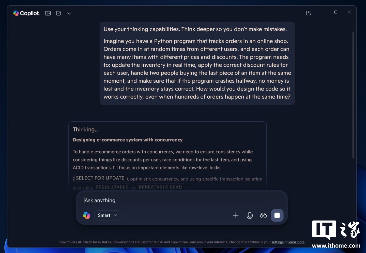 這些嚴(yán)格的限制源于 OpenAI 缺乏足夠的計(jì)算能力來為用戶提供強(qiáng)大的模型支持。然而,Copilot 卻提供了更寬松的限制。在測(cè)試過程中,Windows Latest 發(fā)現(xiàn)很難確定何時(shí)會(huì)達(dá)到 Copilot 的 GPT-5 智能模式每日使用限制,且并未明確說明每天可以觸發(fā)多少次“思考”。不過其注意到,Copilot 每天最多會(huì)切換至“思考”模式五次。對(duì)于普通查詢(非思考類),尚不清楚 Copilot 是將查詢路由至 GPT-5 還是 GPT-5-mini,但從對(duì)話質(zhì)量來看,似乎更傾向于前者。