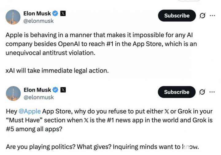 本周早些時(shí)候,馬斯克在其X中發(fā)文指責(zé)蘋果偏袒OpenAI,并將ChatGPT推上App Store排行榜榜首。馬斯克表示,蘋果的這種行為已經(jīng)違反了反壟斷法,xAI“將立即采取法律行動”。