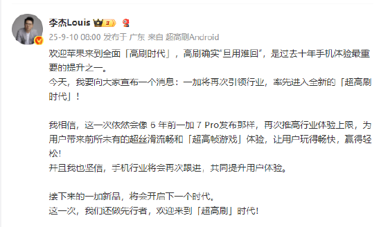 9月10日消息,一加中國(guó)區(qū)總裁李杰今日微博發(fā)文稱,歡迎蘋果來到全面‘高刷時(shí)代’。他表示,高刷確實(shí)“但用難回”,是過去十年手機(jī)體驗(yàn)最重要的提升之一。