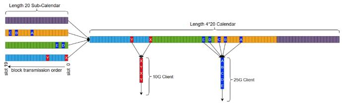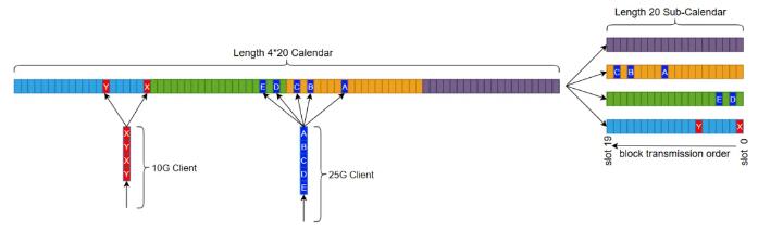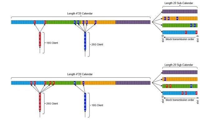 FlexE Shim 時(shí)隙配置,通過(guò) Calendar 機(jī)制,為每個(gè)Client接口提供靈活、動(dòng)態(tài)可調(diào)的配置。不同速率的Client接口,F(xiàn)lexE Shim將其業(yè)務(wù)數(shù)據(jù)按5G的顆粒度,靈活分配到業(yè)務(wù)承載通道上,實(shí)現(xiàn)多種速率接口靈活復(fù)用。