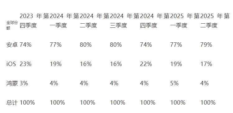 附上 2023 年第 4 季度到 2025 年第 2 季度全球手機(jī)系統(tǒng)分布圖表如下: