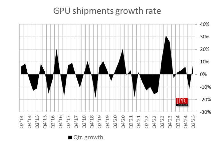 而如果考慮全平臺全類型市場,則 2025 年二季度 GPU 整體出貨量實(shí)現(xiàn)了 4.9% 同比增長,相較十年平均水平提升了 5.2%。此外桌面 GPU 出貨同比增長 11.0%、筆記本電腦 GPU 增長 2.5%。