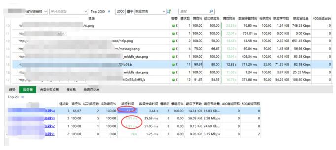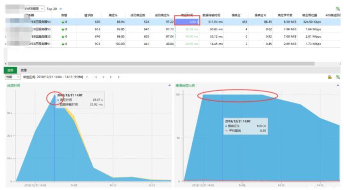 此外,從HTTP應(yīng)用性能分析模塊回溯數(shù)據(jù),發(fā)現(xiàn)同一個(gè)URL有的不同服務(wù)器提供服務(wù),對(duì)比各個(gè)服務(wù)器的響應(yīng)時(shí)間,發(fā)現(xiàn)只有“xxx.xxx.xxx.54”這個(gè)服務(wù)器的響應(yīng)時(shí)間異常。